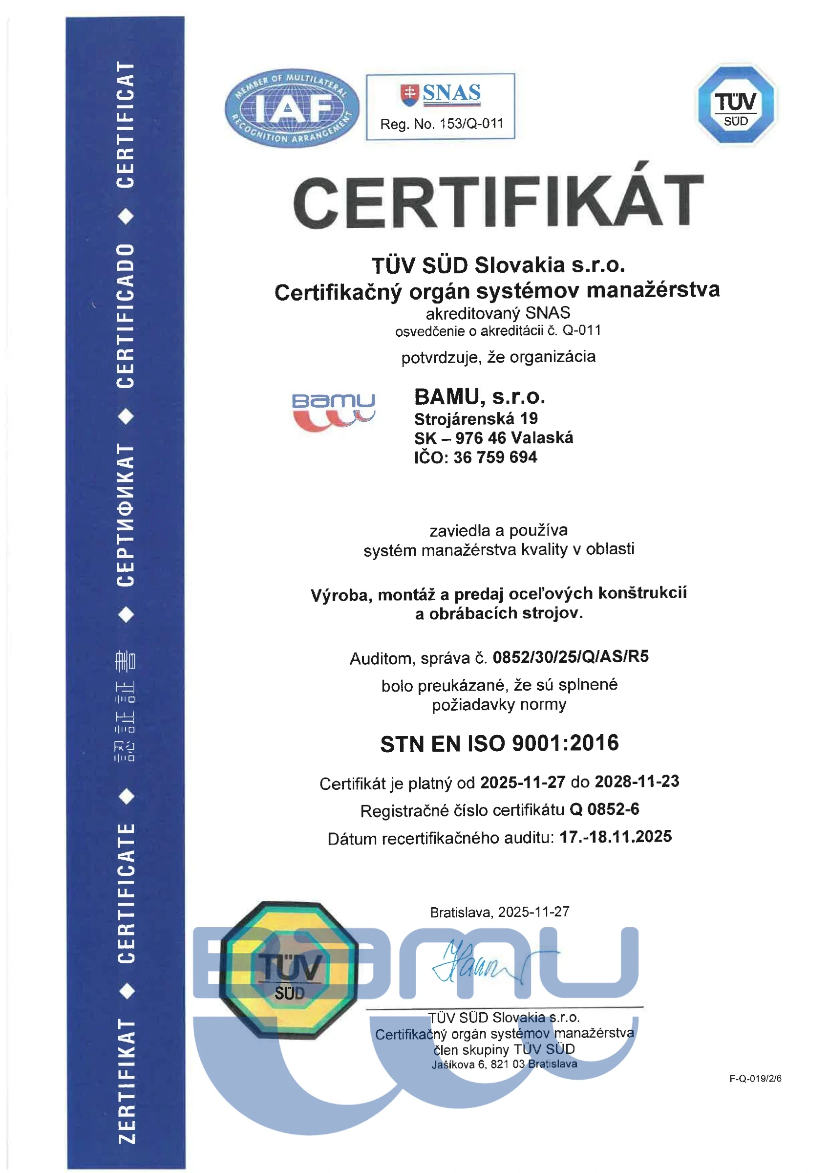 Spoločnosť BAMU sa rozhodla certifikovať svoju prácu, aby zaručila výrobnú kvalitu a kvalitu technologických inovácií.